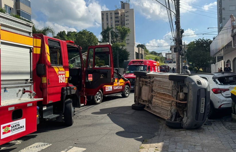 De acordo com as informações apuradas no local, o acidente envolveu quatro veículos. O condutor de um Renault Kwid realizava uma manobra quando foi atingido por uma Fiat Fiorino, com placas de Gaspar. Com o impacto, a Fiorino acabou tombando na via e, na sequência, atingiu outros dois veículos que estavam estacionados paralelamente à rua.
