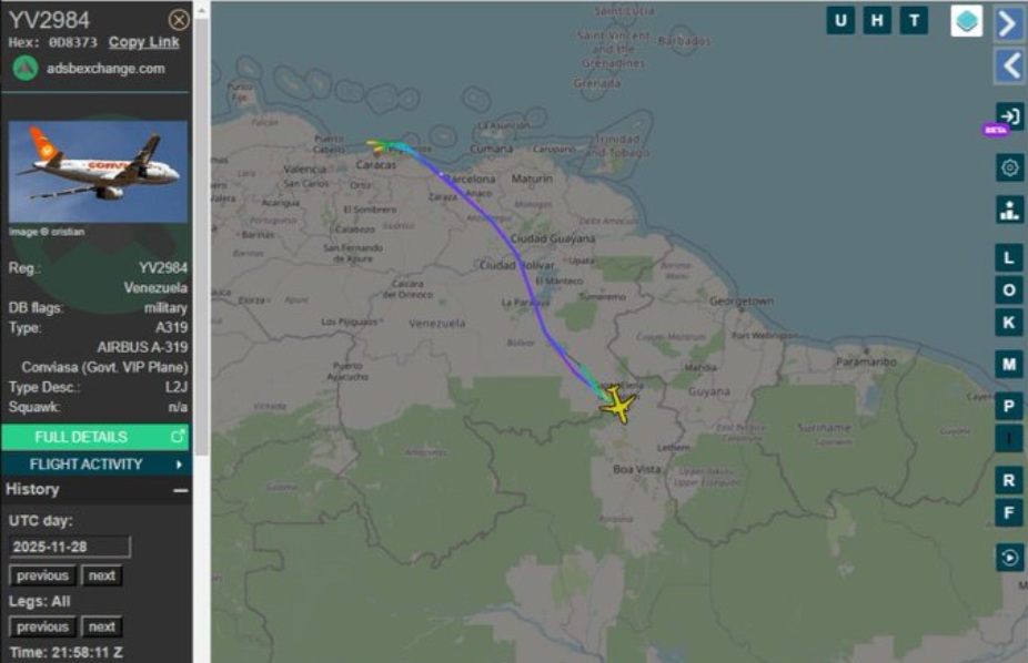 A plataforma de monitoramento de voos ADSB Exchange identificou que um Airbus A-319, matrícula YV2984, operado pela estatal venezuelana Conviasa, teria pousado no Aeroporto de Santa Elena de Uairén, a cerca de 250 km da fronteira com o Brasil. O avião é descrito como uma “aeronave VIP do governo” e é frequentemente utilizado em viagens oficiais pelo ditador Nicolás Maduro.