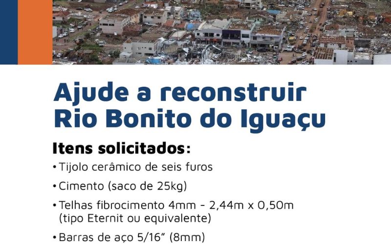 A Prefeitura de Blumenau, por meio da Secretaria de Proteção e Defesa Civil (Sedeci), iniciou uma campanha de arrecadação de materiais de construção para auxiliar as vítimas do tornado que atingiu Rio Bonito do Iguaçu (PR) na última sexta-feira, dia 7. A ação atende a um pedido específico do município paranaense, que identificou a necessidade de itens como tijolo cerâmico de seis furos, cimento em sacos de 25kg, telhas fibrocimento de 4mm com medidas 2,44m x 0,50m (tipo Eternit ou equivalente) e barras de aço 5/16” (8mm).