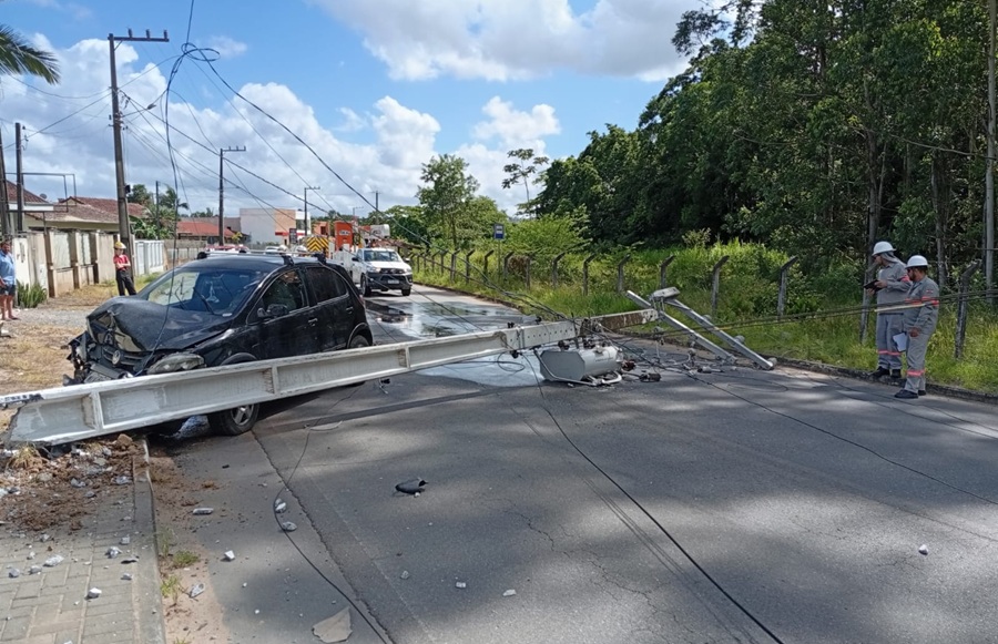 Colisão de carro em poste interdita rua em Indaial por até quatro horas