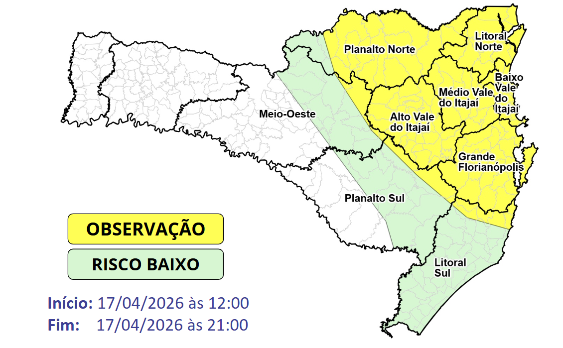 De acordo com a Defesa Civil, o risco é baixo a moderado para ocorrências como alagamentos pontuais, destelhamentos, queda de galhos e árvores e danos na rede elétrica no Vale do Itajaí, Grande Florianópolis, Planalto Norte e Litoral Norte.