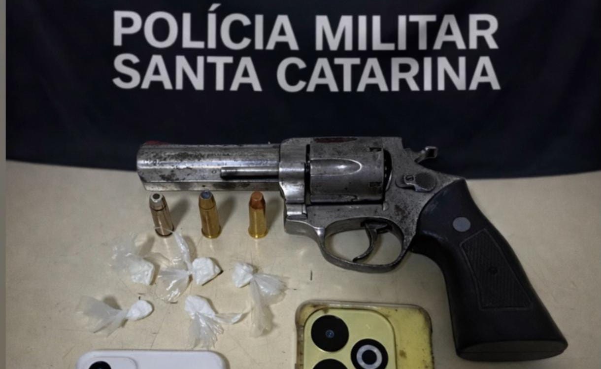 Durante a abordagem, foi localizada uma bucha de cocaína no bolso do indivíduo de 42 anos. Já no interior do veículo, os policiais encontraram, no porta-luvas, um revólver calibre .38 com numeração suprimida, municiado com três munições intactas.