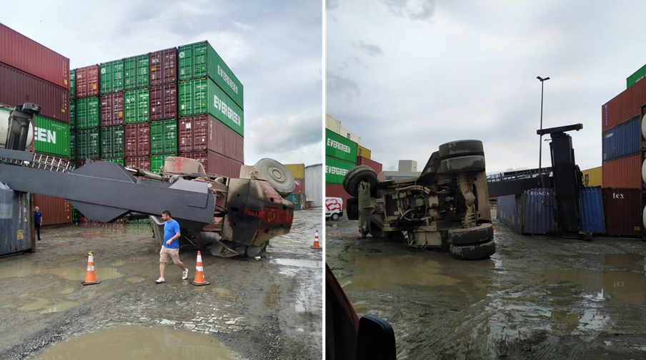 O condutor da empilhadeira já estava fora do equipamento, sentado e sendo auxiliado por funcionários da empresa. Segundo relatos de testemunhas, o acidente ocorreu no momento em que a empilhadeira realizava uma manobra e o rodado traseiro esquerdo saiu do eixo, provocando a perda de sustentação e o consequente tombamento.