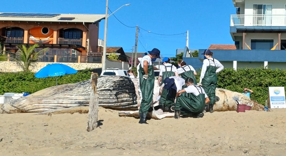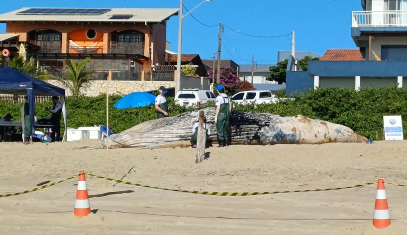 Técnicos do campus da Univali em Penha realizam a coleta de dados e avaliação da carcaça. De acordo com a equipe, o animal está em avançado estado de decomposição, motivo pelo qual foi orientado que moradores e turistas não se aproximem, devido aos riscos biológicos.