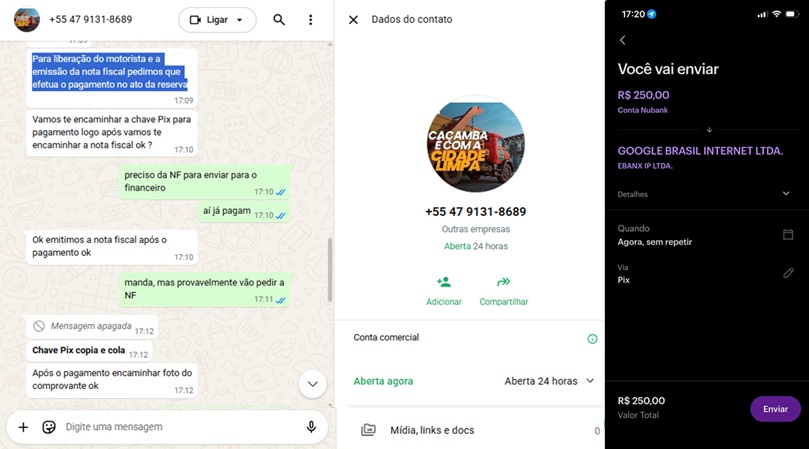 Empresas do ramo já haviam sugerido essa pauta ao Mesorregional, mas os relatos haviam diminuídos em seguida, mas hoje, um leitor nos procurou sob a desconfiança que estava sofrendo um golpe e também fizemos contato com o respectivo número, o 47 9131-8689 e rapidamente fomos atendidos pelo WhatsApp com fornecimento de todos os detalhes, inclusive a exigência do pagamento antecipado via chave PIX aleatória diretamente do Google, possivelmente para garantirem mais créditos para anúncios.