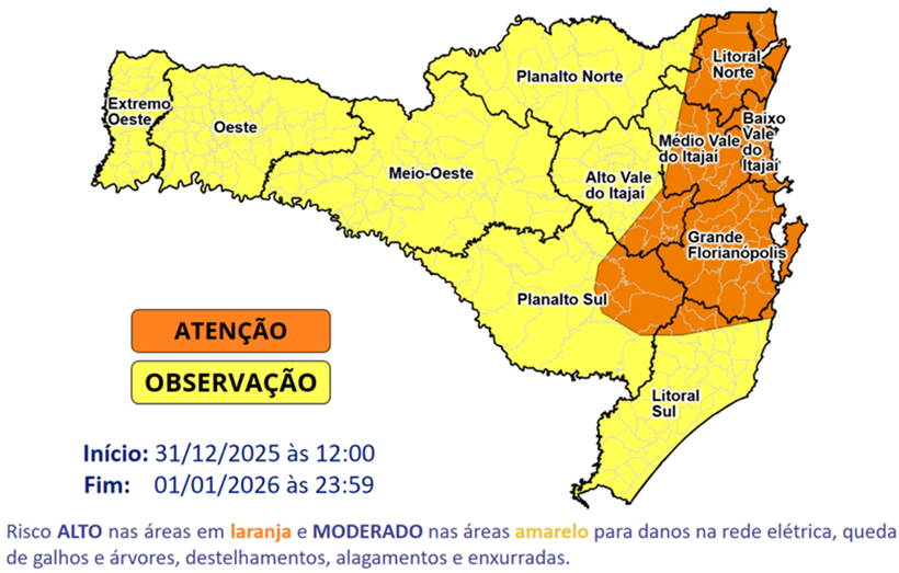 De acordo com dados da Epagri/Ciram, entre a tarde e a noite de quarta-feira (31), último dia de 2025, e quinta-feira (1º), primeiro dia de 2026, a circulação dos ventos em diferentes níveis da atmosfera, associada ao calor e à umidade, favorece a formação de temporais em Santa Catarina. Os eventos devem vir acompanhados de raios, rajadas de vento e chuva intensa em curto período de tempo.