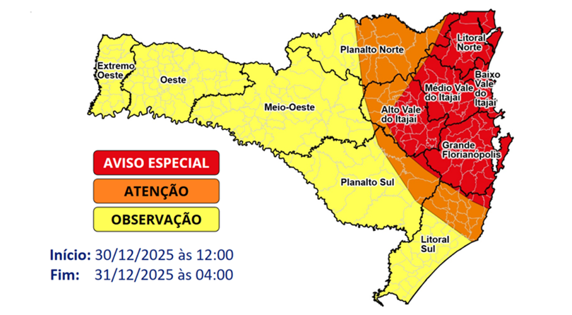 De acordo com dados da Epagri/Ciram, entre a tarde e a noite de quarta-feira (31), último dia de 2025, e quinta-feira (1º), primeiro dia de 2026, a circulação dos ventos em diferentes níveis da atmosfera, associada ao calor e à umidade, favorece a formação de temporais em Santa Catarina. Os eventos devem vir acompanhados de raios, rajadas de vento e chuva intensa em curto período de tempo.