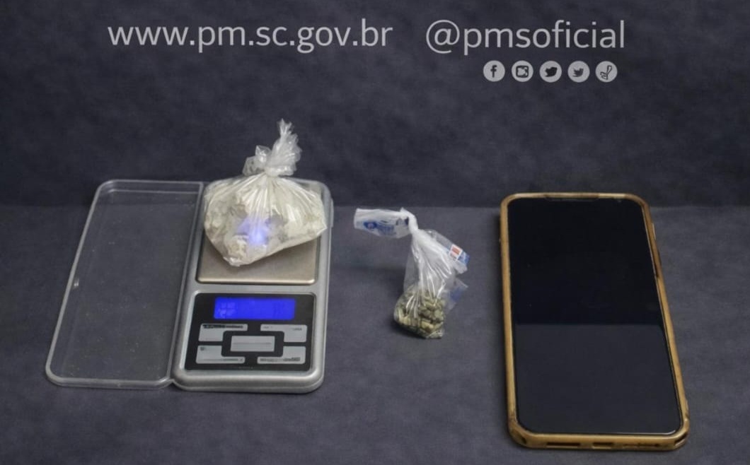Após receber denúncias, a guarnição localizou o suspeito em um veículo na região central da cidade e realizou a abordagem. Durante a busca pessoal e veicular, foram encontrados aproximadamente 30 gramas de substância análoga à cocaína, 1,5 grama de substância análoga à maconha e uma balança de precisão, item comumente utilizado para fracionamento e comercialização de entorpecentes.