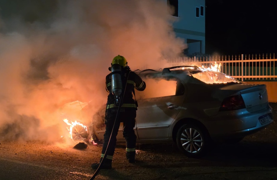 Ao chegar ao local, os bombeiros encontraram um automóvel Volkswagen Voyage tomado pelas chamas, que consumiam completamente a parte dianteira e a cabine do carro.