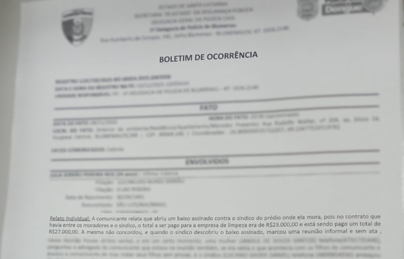 Moradores de um condomínio localizado no bairro Itoupava Central, em Blumenau registraram um Boletim de Ocorrência (BO) contra um síndico profissional, após surgirem suspeitas de irregularidades financeiras, falta de transparência e possível conflito de interesses na administração predial. A notícia-crime foi formalizada diante de indícios envolvendo pagamentos a uma empresa de limpeza e conservação acima dos valores previstos em contrato, sem autorização das assembleias ou prestação de contas considerada satisfatória pelos condôminos.