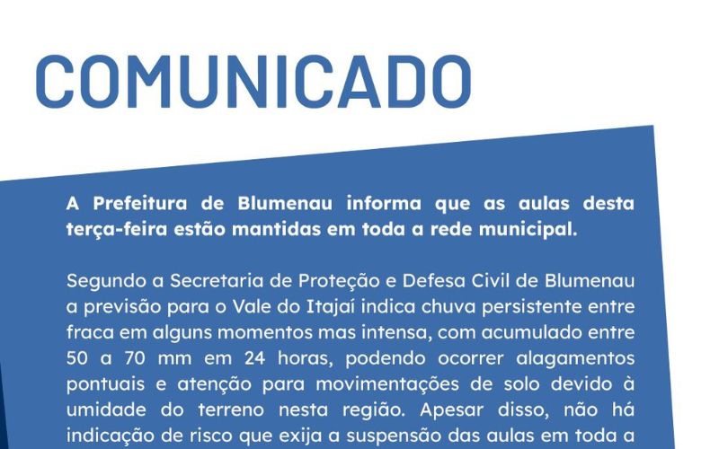 A Prefeitura de Blumenau, por meio da Secretaria Municipal de Educação (Semed), anunciou nesta segunda-feira (08/12) que as aulas estão mantidas em toda a rede municipal de ensino nesta terça-feira (09/12), mesmo com a previsão de chuva persistente no Vale do Itajaí.