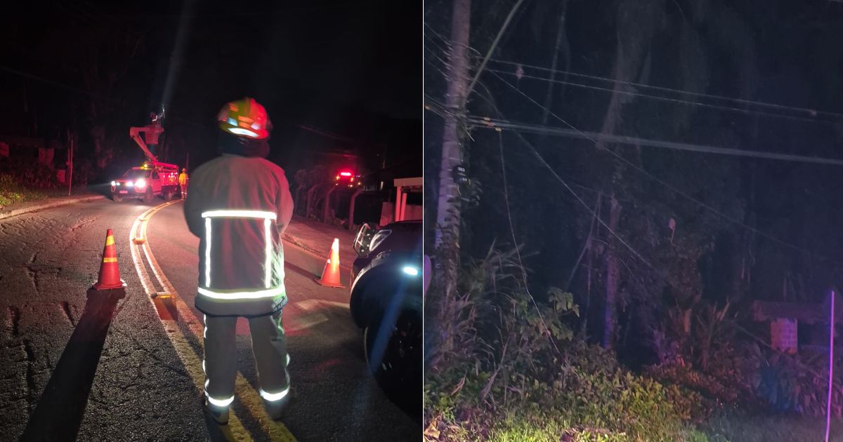 Um ônibus ficou com a fiação presa sobre o veículo na madrugada desta quinta-feira (2), em Pomerode, após um rompimento