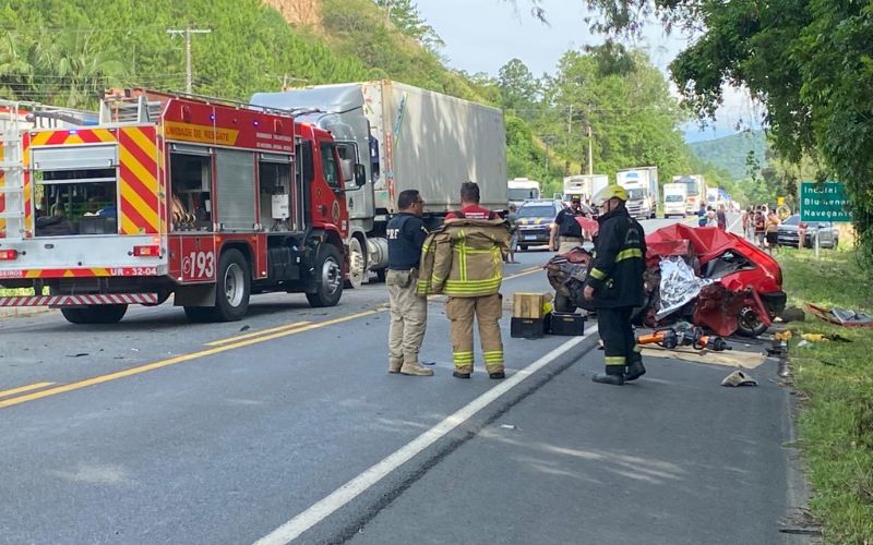 No veículo de passeio, as quatro vítimas enfrentaram situações críticas, sendo que o homem que dirigia não resistiu aos ferimentos e teve o óbito confirmado antes mesmo da chegada das guarnições. Uma mulher ficou presa às ferragens, foi desencarcerada e precisou ser entubada pela equipe médica do SAMU ainda dentro da ambulância, sendo encaminhada em estado gravíssimo para o Hospital Santa Isabel, em Blumenau. Além disso, uma criança que estava no veículo foi resgatada pelos bombeiros com ferimentos leves e levada para avaliação hospitalar, enquanto a quarta vítima também recebeu os atendimentos iniciais no trecho do acidente.
